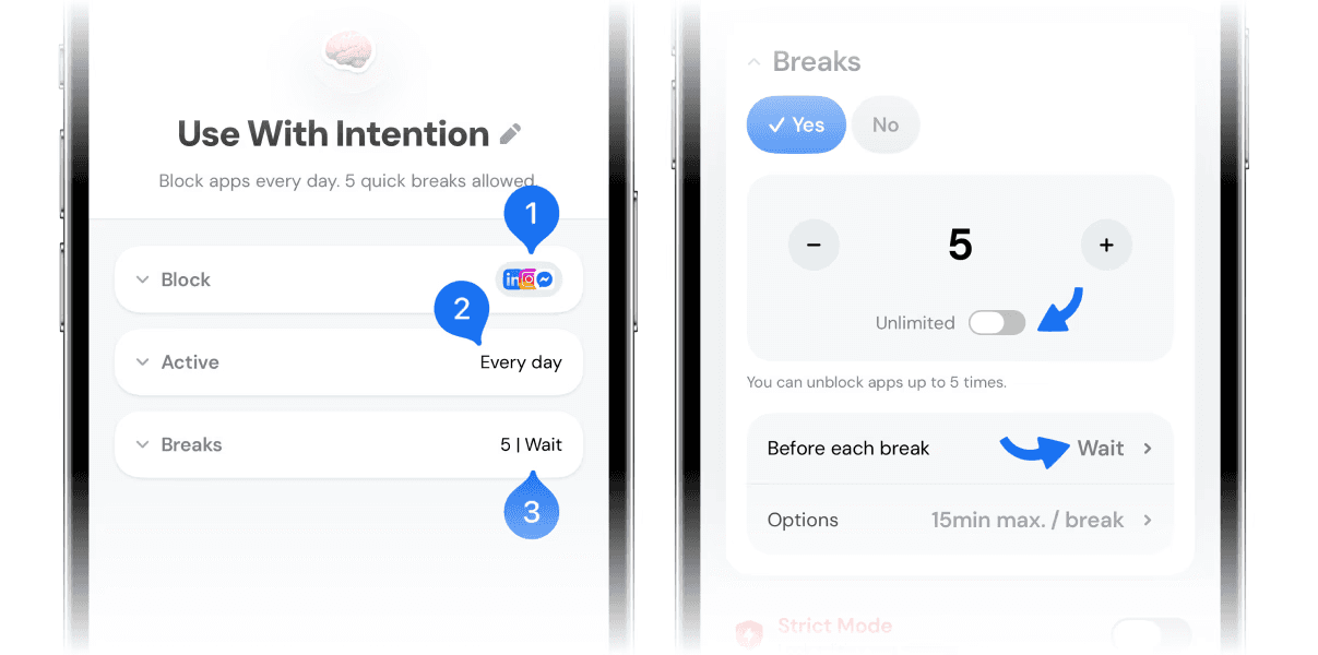 In Breaks → allow yourself only 4–5 breaks per day (that’s more than enough… If you take just 5 breaks of 15 minutes, that’s already 1h25 per day on these apps).