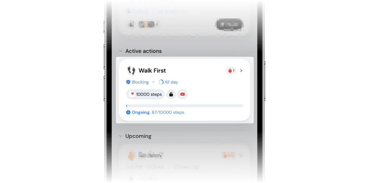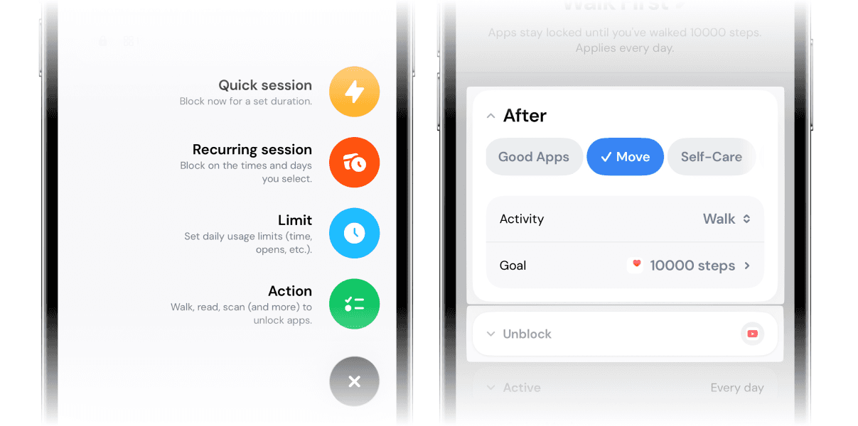 For example, start by simply reaching 10,000 steps. Studies show that walking 10,000 steps a day has real positive effects on your health. That’s enough to unlock Instagram, TikTok, or YouTube — apps that probably keep you sitting for hours, leaning forward, thumb working overtime.