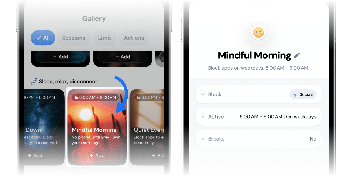 Set up a Session in the Jomo app, available for free on iPhone, iPad, and Mac. Choose the time window when you usually wake up (for example, 7:00–7:45 AM) and block distracting apps like social media. That way, even if you feel tempted, you won’t be able to open them.