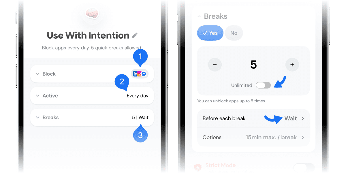 In Breaks → enable only 4–5 breaks per day (that’s enough… even 5 breaks of 15 minutes is already 1h25 on those apps per day).