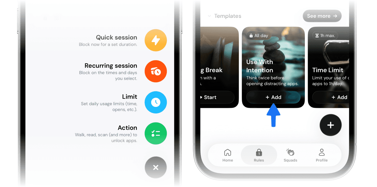 In Jomo, you’ll set up a rule called “Use With Intention.” It’s simple: by default, the selected apps are blocked. To access them, you have to complete an action. And of course, the time you spend on them will be limited. You can still consume — but in small, controlled doses.