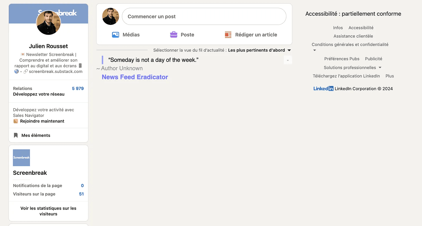 Even before I started writing content on LinkedIn, I was already spending a lot of time there. It kept growing. A few months ago, I installed the News Feed Eradicator extension—and I never looked back. Basically, it replaces your news feed with an inspirational quote.